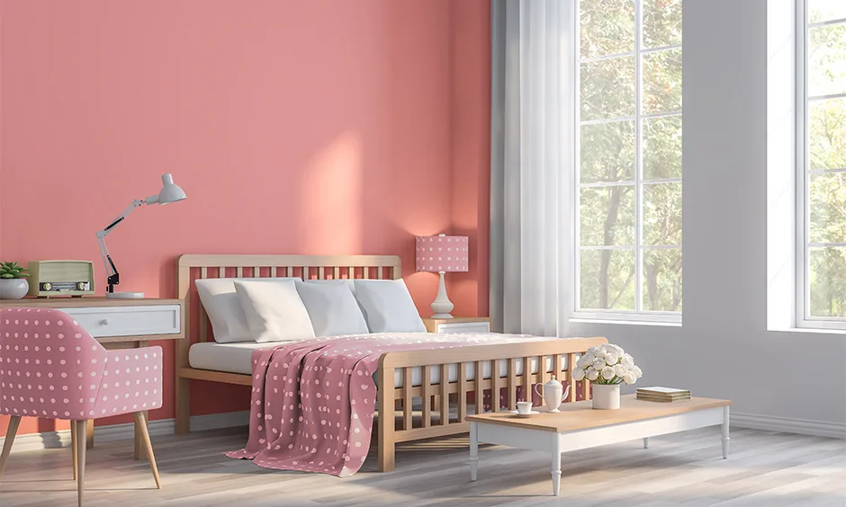 Hồng san hô là màu sắc nhẹ nhàng, thân thiện và tạo cảm giác dễ chịu. Bảng màu hồng đậm kết hợp lớp sơn mờ tạo nên không gian ấm áp, thân thiện. Khi kết hợp cùng tường trắng và sàn gỗ, sắc hồng nổi bật hơn. Màu này còn mang lại nét tự nhiên và gần gũi cho căn phòng.