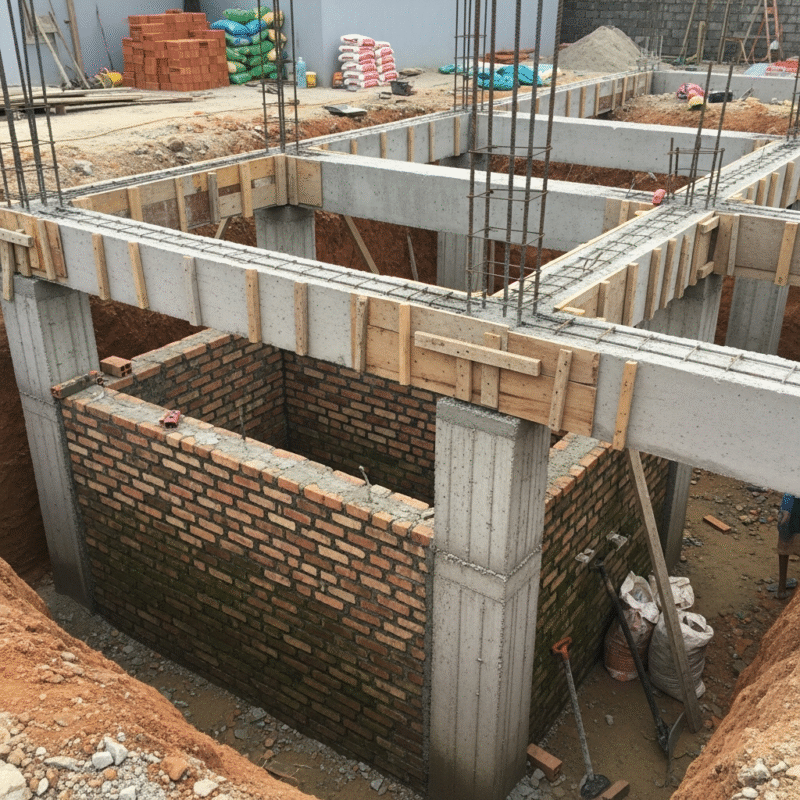 👉 Nhà từ 2 tầng, bể dưới móng, đất yếu → bắt buộc nên xây tường 20.