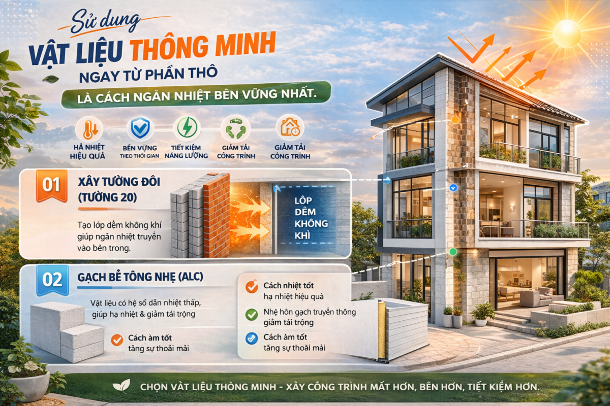 Sử dụng vật liệu thông minh ngay từ phần thô là cách ngăn nhiệt bền vững nhất.