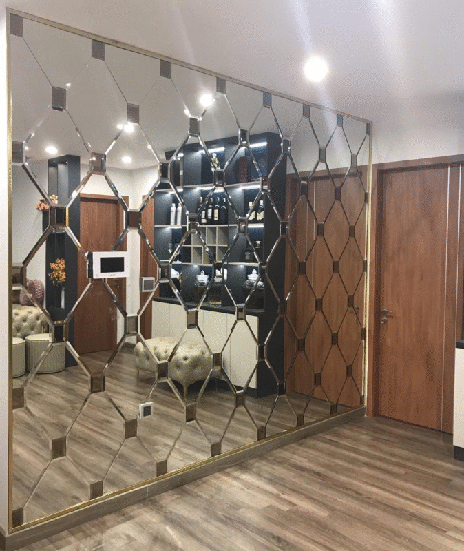 Loại gương này được cắt vát mép tạo góc 45 độ. Sau đó ghép thành mảng tường có hình ô vuông, kim cương hoặc chữ nhật. Khi ánh sáng chiếu vào, các mặt vát phản chiếu lấp lánh, rất sang trọng. Đây là lựa chọn yêu thích trong các phòng khách phong cách tân cổ điển hoặc chung cư cao cấp.