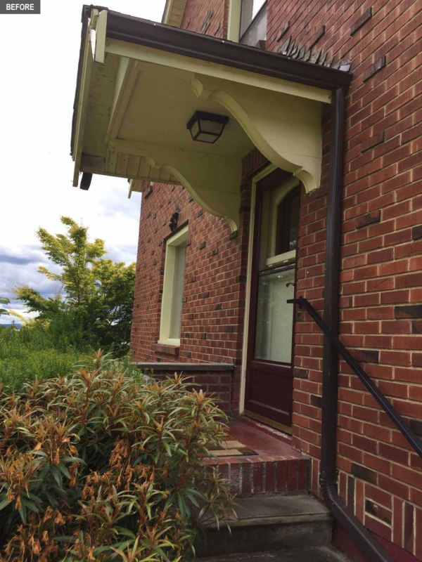 Ở phía sau, mái hiên gỗ cũ được thay bằng mái kim loại dốc màu đen hiện đại.