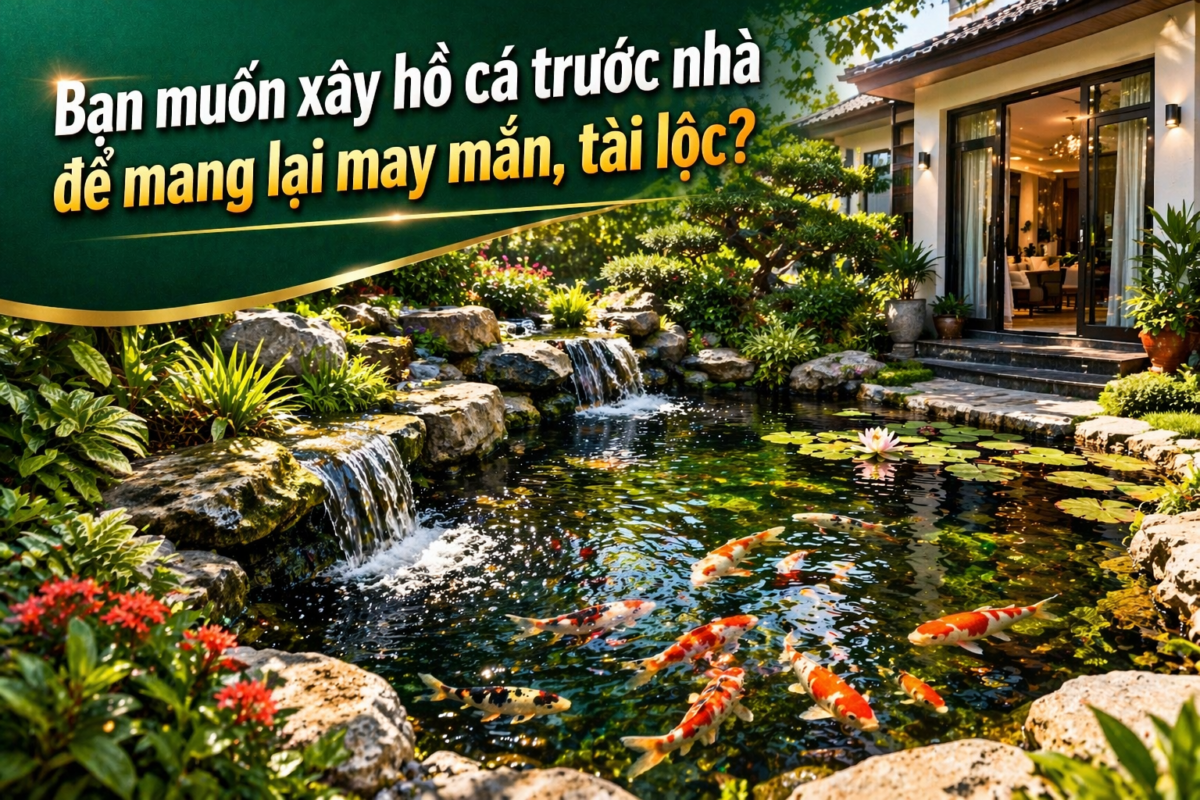Hồ cá trước nhà tượng trưng cho tài lộc (Hành Thủy). Bố trí hợp lý giúp: