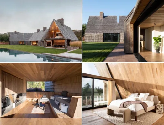 Ngôi nhà có bố cục hình chữ H với mặt ngoài được ốp bằng gỗ [...]