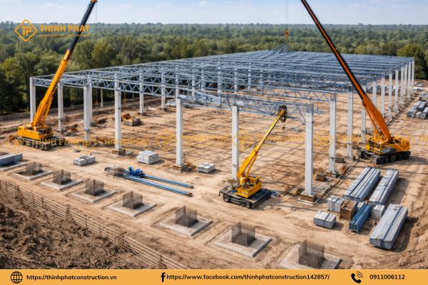 Nền đất yếu là vấn đề phổ biến khi xây dựng nhà xưởng, đặc biệt tại những khu vực có địa chất mềm hoặc nhiều bùn. Nếu xử lý không đúng kỹ thuật, công trình rất dễ xảy ra tình trạng lún, nứt chỉ sau một thời gian ngắn sử dụng. Vì vậy, việc khảo sát và xử lý nền đất trước khi thi công luôn là bước quan trọng để đảm bảo độ bền và an toàn cho công trình. Với kinh nghiệm trong lĩnh vực thi công nhà xưởng, Thịnh Phát Construction luôn chú trọng khâu xử lý nền móng ngay từ đầu, áp dụng các giải pháp phù hợp nhằm mang lại nền móng vững chắc và tối ưu chi phí cho khách hàng.